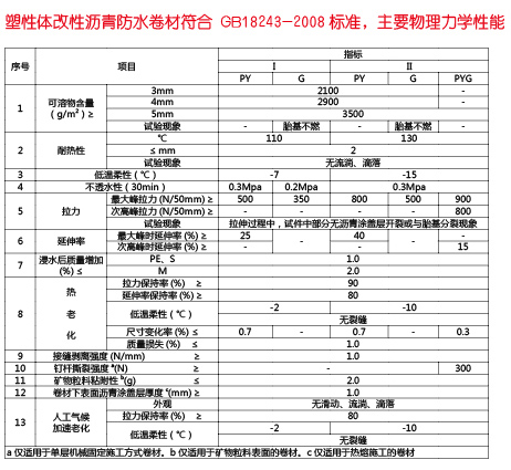 塑性体改性沥青防水卷材是指以聚酯胎、玻纤毡、玻纤增强聚酯毡为胎基,以无规聚丙烯(APP)或聚烯烃类聚合物(APAO、APO等)作石油沥青改性剂,两面覆以隔离材料所制成的防水卷材。